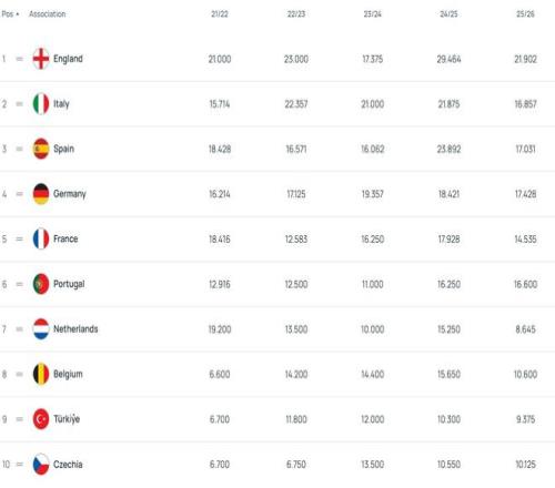 目前的欧战积分中,英格兰21.902分断档领先,德甲、西班牙、意大利和葡萄牙分列2-5位,法国排在第6。